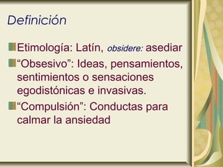 Este documento define el trastorno obsesivo compulsivo (TOC) y describe sus características principales. Explica que las obsesiones son pensamientos, ideas o sensaciones invasivas e indeseadas, mientras que las compulsiones son conductas repetitivas realizadas para reducir la ansiedad causada por las obsesiones. Además, detalla los tipos más comunes de obsesiones y compulsiones, la epidemiología, pronóstico y tratamiento general del TOC, incluyendo farmacoterapia, terapia conductual y cognitiva. Final