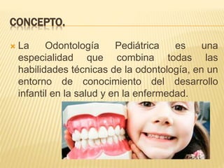Este documento describe los conceptos y procedimientos clave de la odontología pediátrica. Explica que la odontología pediátrica combina habilidades técnicas odontológicas con un entendimiento del desarrollo infantil. También destaca la importancia de la higiene bucal temprana supervisada por los padres y el papel de la primera dentición en el desarrollo infantil. Luego, describe varios procedimientos de terapia pulpar como recubrimiento pulpar directo e indirecto, pulpotomía y pulpect