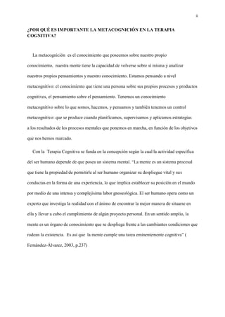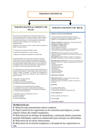 El documento describe las terapias cognitivas de Beck y Ellis. Ambos terapeutas creen que los pensamientos, creencias y esquemas cognitivos juegan un papel central en los trastornos psicológicos. Ellis se enfoca en discutir creencias erróneas con los clientes, mientras que Beck analiza la triada cognitiva, esquemas y distorsiones cognitivas. Ambos usan técnicas cognitivas, conductuales y emocionales para reestructurar pensamientos y lograr cambios a nivel afectivo y de comportamiento