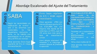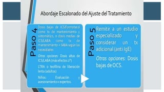 El documento proporciona información sobre el asma. 1) El asma causa síntomas respiratorios variables que pueden limitar la actividad y requerir atención médica urgente en algunos casos. 2) Cuando el asma está bien controlada, los pacientes pueden evitar síntomas, necesitar poca medicación y llevar una vida activa. 3) El diagnóstico y tratamiento del asma se basan en los síntomas, la función pulmonar y la respuesta al tratamiento.