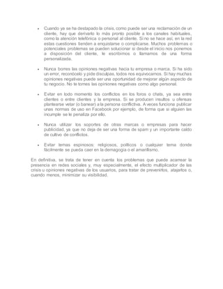 Este documento discute los beneficios y riesgos de la presencia de marcas y empresas en las redes sociales. Señala que aunque las redes sociales permiten una valiosa interacción con los clientes, también pueden generar conflictos y crisis si no se gestionan adecuadamente las quejas de los clientes. Ofrece una serie de consejos como derivar rápidamente las quejas a canales formales de atención al cliente, no eliminar opiniones negativas y evitar conflictos en foros o chats para prevenir y manejar posibles crisis en las redes social