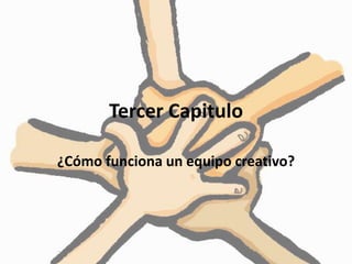 El documento discute la diferencia entre grupos y equipos creativos, señalando que los equipos creativos trabajan de manera coordinada para generar sinergia positiva y nuevas ideas. Explica que formar equipos creativos efectivos es complicado, ya que a menudo los trabajadores actúan como grupos en lugar de equipos. Finalmente, proporciona sugerencias para trabajar creativamente en equipos como planificar reuniones con anticipación, brindar un ambiente adecuado para la comunicación de ideas y asegurar que haya un líder y enfo