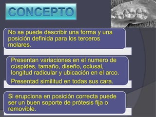 Los terceros molares presentan variaciones en su número de cúspides, tamaño, diseño oclusal, longitud radicular y ubicación en el arco. Si erupcionan en posición correcta, pueden ser un buen soporte para prótesis fijas o removibles. Generalmente comienzan a erupcionar entre los 18 y 25 años de edad.