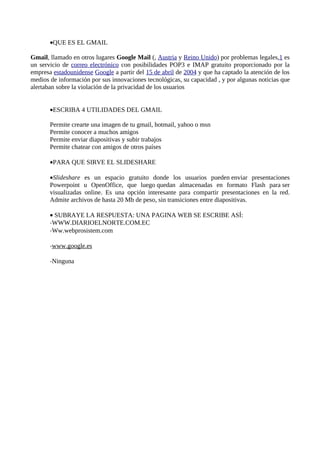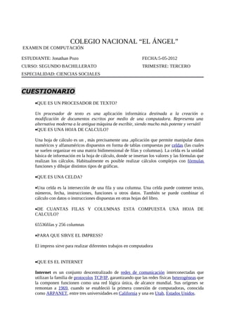 Este documento es un examen de computación para el estudiante Jonathan Pozo del Colegio Nacional “El Ángel”. Contiene preguntas sobre procesadores de texto, hojas de cálculo, celdas, características de una hoja de cálculo, el programa Impress, Internet, Gmail y SlideShare. Las preguntas son respondidas brevemente describiendo cada tema.