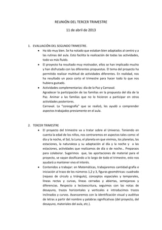 El segundo trimestre fue exitoso y el proyecto motivador. El tercer trimestre se centrará en el universo, incluyendo el sol, la luna y los planetas. Se revisaron las cuentas de la cooperativa y se decidió dejar el saldo para el próximo curso.