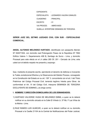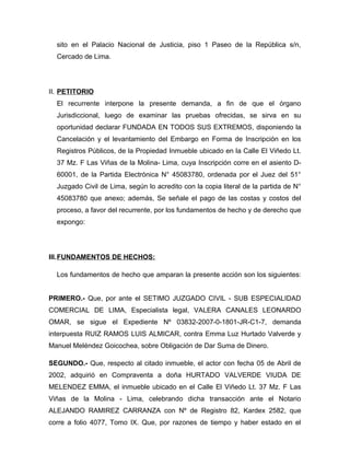 El demandante interpone una demanda de tercería excluyente de dominio contra dos demandados. Solicita que se declare fundada la demanda y se ordene la cancelación del embargo que pesa sobre un inmueble de su propiedad, el cual adquirió antes de que se ordenara el embargo. Alega que es el propietario legítimo del inmueble y que este fue embargado erróneamente en un proceso entre los demandados. Presenta diversos fundamentos fácticos y jurídicos en apoyo de su demanda.