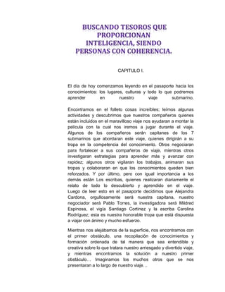 El documento narra las aventuras de un grupo de estudiantes que realizan un viaje submarino para aprender. En su viaje se enfrentan a varios obstáculos como fallas en su submarino y actividades de aprendizaje. Visitan varias islas donde realizan análisis literarios, obras de teatro y aprenden sobre referencias anafóricas. Su viaje continúa mientras descubren más sobre literatura y cohesión a través de textos encontrados.