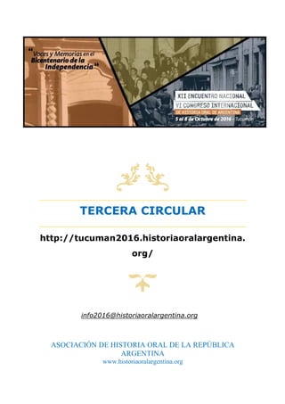Este documento proporciona información sobre la inscripción y los pagos anticipados para el XII Encuentro Nacional y VI Congreso Internacional de Historia Oral "Voces y Memorias en el Bicentenario de la Independencia" que se llevará a cabo en Tucumán, Argentina. Detalla las categorías de expositores, asistentes y estudiantes, así como los costos y fechas límite para los descuentos de inscripción. También incluye información sobre los talleres de formación que se ofrecerán durante el evento.