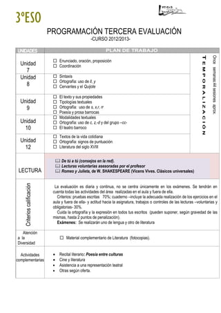 Este documento presenta el plan de trabajo y evaluación para el tercer trimestre del curso 2012/2013 de Lengua Castellana y Literatura para alumnos de 3o de Educación Secundaria Obligatoria. Incluye las unidades didácticas sobre gramática, ortografía y literatura que se cubrirán, así como criterios de evaluación, lecturas recomendadas y actividades complementarias.