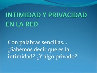 Este documento trata sobre la intimidad y el respeto en Internet. Explica que la intimidad se refiere a la parte privada de la vida de una persona, como sus pensamientos y datos personales. Advierte que la información que se publica en Internet puede permanecer allí para siempre, por lo que hay que ser cuidadoso con lo que se comparte. También define el ciberacoso como el uso de medios electrónicos para acosar psicológicamente a otros, y señala que puede tener efectos importantes debido a que la información compartida en línea puede verse por muchas