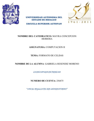 Este documento proporciona instrucciones sobre cómo formatar celdas en Excel, incluyendo el formato de números, la alineación, y la fuente. Explica cómo cambiar el formato de números a categorías como moneda o fecha, y cómo crear formatos personalizados. También describe cómo alinear texto horizontal y verticalmente, y cómo modificar la fuente, tamaño, estilo y color.