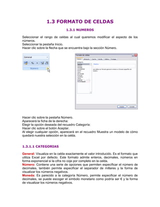 Este documento proporciona instrucciones sobre cómo formatar celdas en Excel, incluyendo el formato de números, la alineación, y la fuente. Explica cómo seleccionar un rango de celdas y aplicar formatos numéricos como moneda o porcentaje, así como opciones de alineación horizontal, vertical y de texto. También describe cómo cambiar el tipo, tamaño, estilo y color de la fuente.