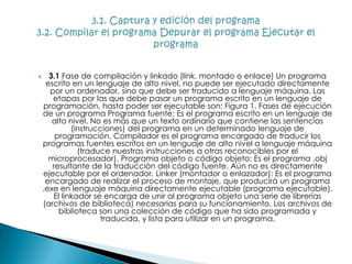 Un programa debe pasar por varias etapas antes de ser ejecutable, incluyendo la compilación en la que un compilador traduce el código fuente a código objeto, y el enlace en el que se une el código objeto con bibliotecas para generar un ejecutable. Los errores pueden ocurrir durante la compilación si hay errores de sintaxis, o durante la ejecución si hay errores lógicos. Los depuradores ayudan a identificar y corregir errores de ejecución al permitir ejecutar el programa paso a paso