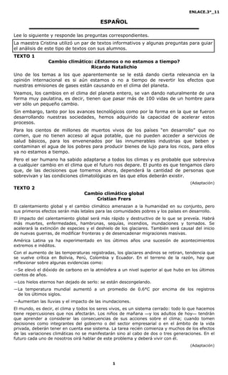El documento presenta dos textos informativos sobre el cambio climático. El primer texto discute si aún es posible revertir los efectos de las emisiones de gases en el clima y cómo los cambios climáticos afectan de manera desproporcionada a los países en desarrollo. El segundo texto describe las consecuencias del calentamiento global como muertes, enfermedades y migraciones masivas, e insta a considerar las consecuencias de las acciones humanas sobre el clima. La maestra utilizó preguntas para guiar el análisis de est