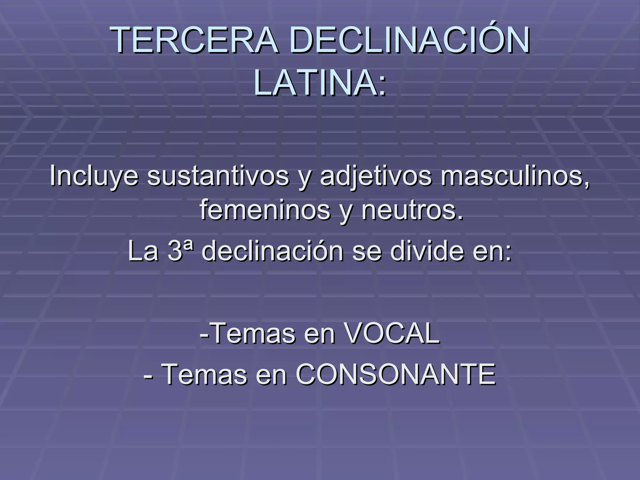 El documento describe la tercera declinación latina. Se divide en temas en vocal y temas en consonante. Los temas en consonante se subdividen en temas en oclusiva, silbante, líquida y nasal. Los temas en oclusiva y silbante son siempre sigmáticos, mientras que los temas en líquida son asigmáticos. Algunos temas en nasal pueden ser de uno u otro tipo.
