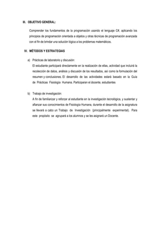 Este silabo describe la asignatura de Programación I que se imparte en el segundo semestre de la carrera de Sistemas. La asignatura tiene una carga de 5 créditos y 80 horas totales, divididas entre teoría y práctica. El objetivo general es comprender los fundamentos de la programación usando el lenguaje C#, aplicando conceptos de programación orientada a objetos. El silabo proporciona detalles sobre el docente a cargo, los pre-requisitos, co-requisitos, métodos de enseñanza como prácticas de laboratorio y