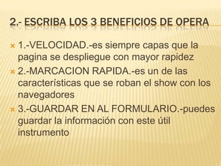 El documento describe cómo abrir diferentes versiones de los navegadores Mozilla Firefox y Google Chrome, los tres principales beneficios del navegador Opera (velocidad, marcación rápida y guardar en al formulario), y la diferencia entre un navegador y un buscador, siendo que un navegador muestra páginas en HTML mientras que un buscador opera dentro de su propia base de datos al ingresar palabras clave.