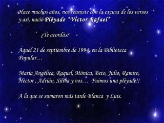 Este documento habla sobre la reunión de un grupo de poetas llamado Pléyade "Víctor Rafael" en 1994. Menciona que la autora del documento ha publicado varios libros de poesía desde su primer libro publicado en 1979. También describe que la autora ha escrito muchos poemas a lo largo de los años inspirada por sus hijas, amigos poetas y diferentes experiencias de la vida.