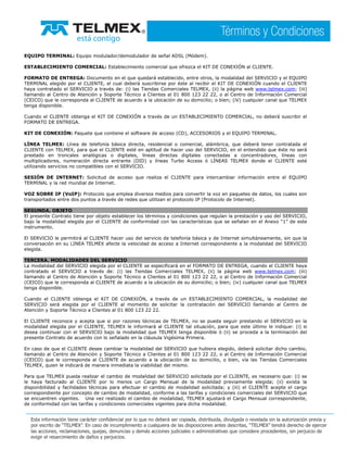 Este documento es un contrato entre Teléfonos de México (Telmex) y un cliente para la prestación del servicio de acceso a Internet Infinium. El contrato establece los términos y condiciones del servicio, incluyendo las definiciones de los componentes involucrados, las modalidades y requisitos del servicio, la entrega del kit de conexión, la activación y soporte técnico del servicio.