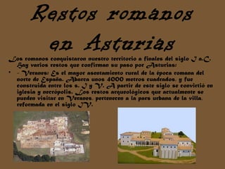 Los romanos conquistaron el territorio asturiano en el siglo I a.C. Dejando varios restos arqueológicos, incluyendo las termas romanas de Gijón junto a la iglesia de San Pedro, el torreón de vigilancia en Sobrescobio, y el puente romano en Siero. Los astures eran un pueblo guerrero con una economía basada en la ganadería, que vivía en castros amurallados y se enfrentó a Roma en las Guerras Cántabras.