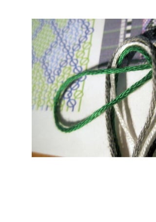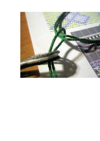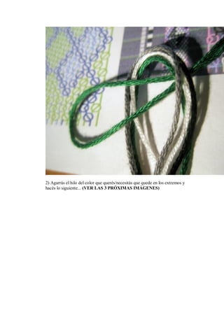 El documento describe los pasos para hacer pulseras usando nudos. Explica los 4 nudos básicos y cómo doblar los hilos a la mitad para comenzar. Luego detalla cada paso para hacer la pulsera, incluyendo imágenes para ilustrar cómo unir los hilos. Finalmente, recomienda una forma más elaborada de unir los extremos usando un nudito especial para dar un toque más profesional.