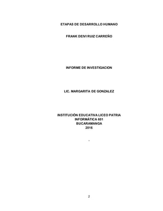 El documento describe las 7 etapas del desarrollo humano, incluyendo la etapa prenatal que consiste en el periodo germinal, embrionario y fetal. Luego describe las etapas de la infancia, niñez, adolescencia, juventud, adultez y ancianidad. Incluye objetivos, procesos y anexos sobre el desarrollo humano.