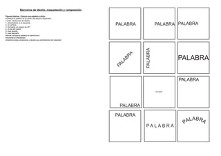 Este documento presenta varios ejercicios de diseño y maquetación que involucran figuras básicas, palabras, títulos e imágenes. Los ejercicios incluyen colocar palabras en diferentes posiciones y tamaños, utilizar tipografías como palo seco en blanco y negro, y componer títulos con bloques de texto de manera simétrica y asimétrica. El objetivo es experimentar con diferentes estilos, formatos y efectos visuales.