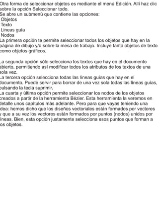 Este documento describe diferentes métodos para seleccionar, mover, copiar y duplicar objetos en CorelDRAW. Se puede seleccionar objetos haciendo clic en ellos o arrastrando un cuadrado de selección. Una vez seleccionados, los objetos pueden moverse haciendo clic y arrastrando o con las teclas de flecha. Los objetos también se pueden copiar y pegar o duplicar para crear copias. Copiar y pegar crea una copia exacta, mientras que duplicar crea una copia desplazada. El documento