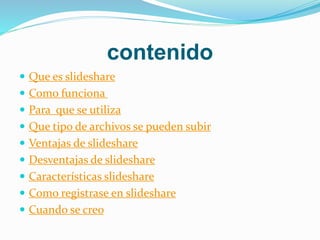 SlideShare es un sitio web que permite a los usuarios subir y compartir presentaciones de diapositivas de forma pública o privada. Los usuarios pueden registrarse gratuitamente para crear un espacio donde almacenar presentaciones en formatos como PowerPoint, que luego son convertidas a flash para su visualización en línea. SlideShare ofrece la ventaja de poder compartir fácilmente presentaciones sin adjuntar archivos pesados en correos electrónicos.