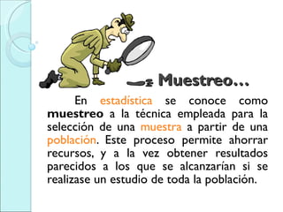 El documento describe diferentes métodos de muestreo y estimación estadística. Explica que el muestreo implica seleccionar una muestra representativa de una población para estudiarla en lugar de estudiar la población completa. Luego describe métodos de muestreo probabilísticos como el aleatorio simple, estratificado y sistemático, así como métodos no probabilísticos. También explica conceptos como estimación puntual, por intervalos, nivel de confianza e error de estimación.