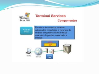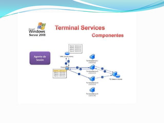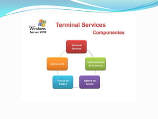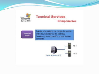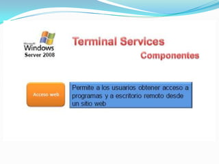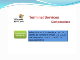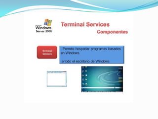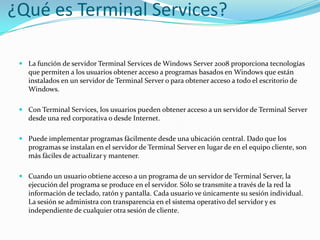 El documento habla sobre Terminal Services en Windows Server 2008. Terminal Services permite a los usuarios acceder a programas y al escritorio completo de Windows instalados en un servidor Terminal desde una red o Internet. Esto facilita la implementación centralizada y actualización de aplicaciones. Los usuarios solo ven su propia sesión aislada, mientras que el programa se ejecuta en el servidor.