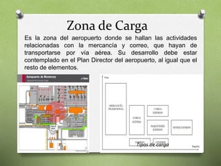 El documento describe las diferentes zonas y componentes de una terminal aérea. Explica que la zona de carga es donde se llevan a cabo las actividades relacionadas con la mercancía y el correo para transporte aéreo. También describe las terminales de pasajeros como los edificios donde se controla el manejo de pasajeros que embarcan y desembarcan, facilitando la conexión con modos terrestres de transporte. Finalmente, detalla los componentes clave de una terminal como pistas, calles de rodaje, plataformas, edificios termin