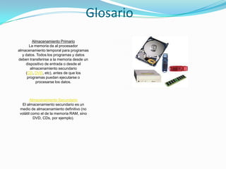 El documento proporciona definiciones y explicaciones sobre conceptos básicos de computación y tecnología, incluyendo almacenamiento primario y secundario, aplicaciones, la autopista de la información, y el uso de estándares como Bluetooth. También menciona la historia de la red ARPANET como precursor de Internet y aborda temas como los buscadores y el ciberbullying. El contenido está dirigido a estudiantes, con referencia a un alumno y profesora específicos.