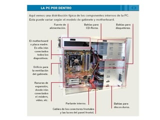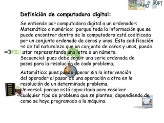 El documento define y describe los principales componentes hardware de una computadora digital, incluyendo la placa madre, microprocesador, memoria RAM, disco duro, tarjetas de video y sonido, y otros componentes como la fuente de alimentación y la carcasa. Explica que estos componentes físicos forman parte del hardware y trabajan juntos mediante instrucciones de software para procesar y almacenar información de forma automática.