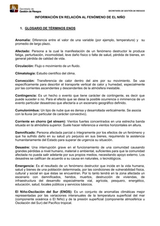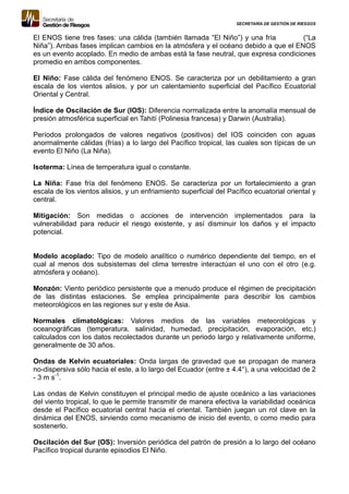 El documento proporciona información esencial sobre el fenómeno de El Niño, su impacto en el clima y las recomendaciones para la mitigación de riesgos. Incluye un glosario de términos relacionados, fases del fenómeno y acciones específicas para preparar, responder y rehabilitar comunidades afectadas por inundaciones y deslizamientos. Se aconseja a los ciudadanos mantener una buena preparación ante emergencias, colaborar en la limpieza de espacios públicos y estar atentos a las recomendaciones de las autoridades.