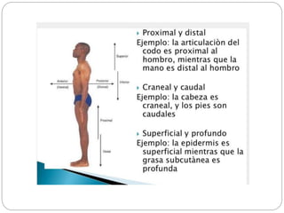 Este documento presenta conceptos básicos de anatomía humana e incluye definiciones de términos anatómicos como anterior-posterior y proximal-distal. Explica la posición anatómica de referencia y los planos de sección como el sagital, coronal y horizontal. También cubre la terminología anatómica combinada, los órganos y regiones del cuerpo, y el uso de eponimias en anatomía.