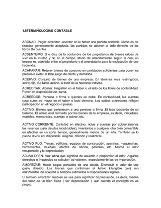 Este documento contiene definiciones de términos contables comunes. Explica conceptos como activo, pasivo, capital contable, inventario, depreciación, costo y otros. Además, incluye la estructura de un plan de cuentas contables típico con definiciones de cuentas como efectivo, cuentas por cobrar, cuentas por pagar y más.