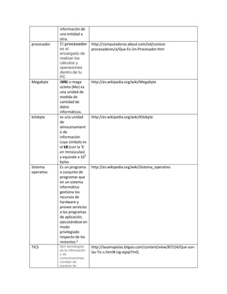 Los documentos definen varios conceptos clave relacionados con la informática y la tecnología, incluyendo aplicaciones, RAM, multimedia, comunicación, procesadores, sistemas operativos, TICs, software, virus, tecnología, periféricos, microprocesadores, internet, datos, información, informática, hardware, memoria RAM, redes, bits, bytes y archivos. Cada concepto incluye una breve descripción y un enlace a Wikipedia u otra fuente para más información.