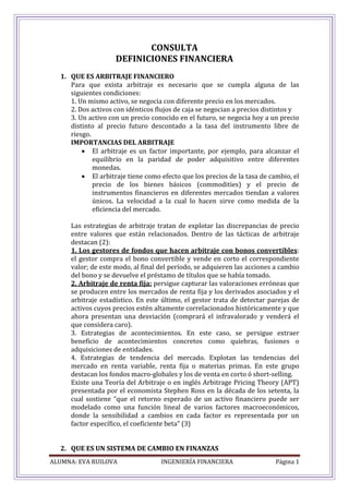 Este documento define varios términos financieros clave como arbitraje financiero, sistema de cambio, elementos de ingeniería financiera (forwards, futuros, swaps y opciones), activo subyacente, precio de ejercicio, contratos de compra y venta, e índices bursátiles. Explica que el arbitraje financiero ocurre cuando hay oportunidades de ganancia aprovechando las discrepancias de precios, y que los sistemas de cambio pueden ser fijos o fluctuantes. Además, describe los elementos básicos de la
