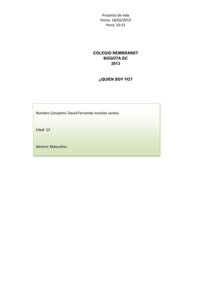 David Fernando Morales Santos es un estudiante de 13 años que vive actualmente solo con su padre en Bogotá. Le gusta escuchar metal, jugar fútbol, videojuegos y usar Facebook. Sus habilidades incluyen ser arquero de fútbol, usar computadoras y jugar videojuegos. Sus debilidades son la pereza, el mal genio y pelear. Su familia la conforman su hermano, hermana y padres. Su interés profesional es ser arquero de fútbol o baterista de una banda de rock.