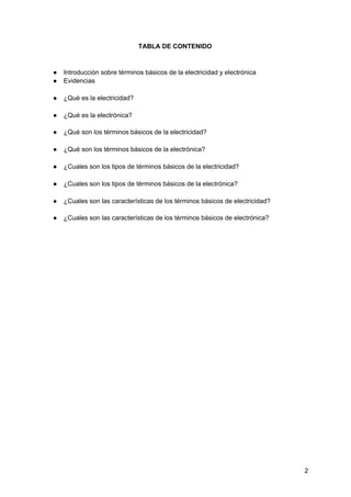 Este documento presenta los términos básicos de la electricidad y la electrónica. Define la electricidad como el movimiento e interacción de cargas eléctricas positivas y negativas, y la electrónica como la transmisión eficiente de electricidad para construir circuitos y artefactos útiles. Explica términos clave de la electricidad como voltaje, corriente, resistencia y potencia, y de la electrónica como resistores, capacitores, semiconductores, diodos, transistores y circuitos integrados.