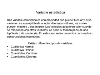 Este documento define diferentes tipos de variables estadísticas, incluyendo variables cualitativas y cuantitativas. Explica que las variables cualitativas pueden ser nominales u ordinales, mientras que las variables cuantitativas pueden ser discretas o continuas. También describe conceptos estadísticos como población, muestra, parámetros, medidas de centralización y dispersión.