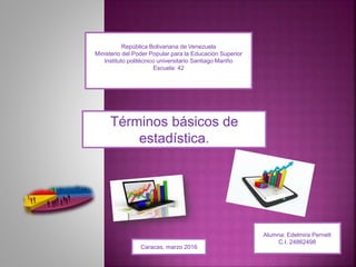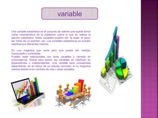 Este documento define conceptos básicos de estadística como variable, población, muestra, parámetros estadísticos, tipos de variables, escalas de medición, razón, proporción, tasa y frecuencia. Explica que una variable es una característica cuantificable de una población y puede ser cualitativa o cuantitativa. Una población es el conjunto de sujetos de estudio y una muestra es un subconjunto de la población. Incluye definiciones de parámetros, razón, proporción, tasa y frecuencia