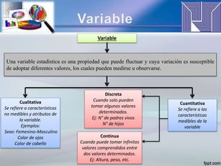 El documento presenta conceptos básicos de estadística como variables, población, muestra, parámetros, escalas de medición y términos como razón, proporción y tasa. Explica que una variable puede ser cualitativa o cuantitativa y discreta, continua o nominal/ordinal. Además, define población, muestra, parámetro, y tipos de escalas de medición como nominal, ordinal, de intervalo y razón.