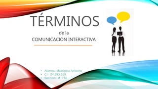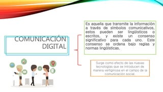 El documento describe varios conceptos clave relacionados con la comunicación digital y la web. Explica que la comunicación digital transmite información a través de símbolos y que la comunicación interactiva permite la interacción directa entre emisor y receptor. También define características de la web 1.0, 2.0 y 3.0, e hipervínculos, y describe brevemente formatos de imagen como BMP y JPG.