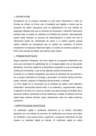 La encriptación es el proceso de cifrar información para que sea ilegible sin los datos de descifrado. Las firmas digitales usan esquemas matemáticos para demostrar la autenticidad y autoría de un mensaje digital mediante el uso de claves privadas. Los certificados digitales son archivos que asocian datos de identidad a una entidad y son emitidos por autoridades certificadoras confiables para autenticar usuarios e identidades digitales.