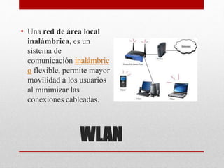 Este documento define y explica brevemente varios términos relacionados con redes de computadoras, incluyendo WLAN, Ethernet, Fast-Ethernet, Gigabit-Ethernet, redes, switches, routers, direcciones IP, protocolos de red como TCP, UDP e Internet, y otros conceptos como dominios, servidores y enrutamiento.