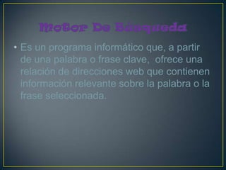 Este documento define varios términos relacionados con la búsqueda de información en Internet, como buscadores generales, buscadores verticales, motores de búsqueda, directorios web, metabuscadores, páginas web, hipervínculos, correo electrónico, proveedores de acceso gratuito, programas de gestión de correo como Outlook, y funciones de agendas y calendarios como tareas diarias, contactos y notas.