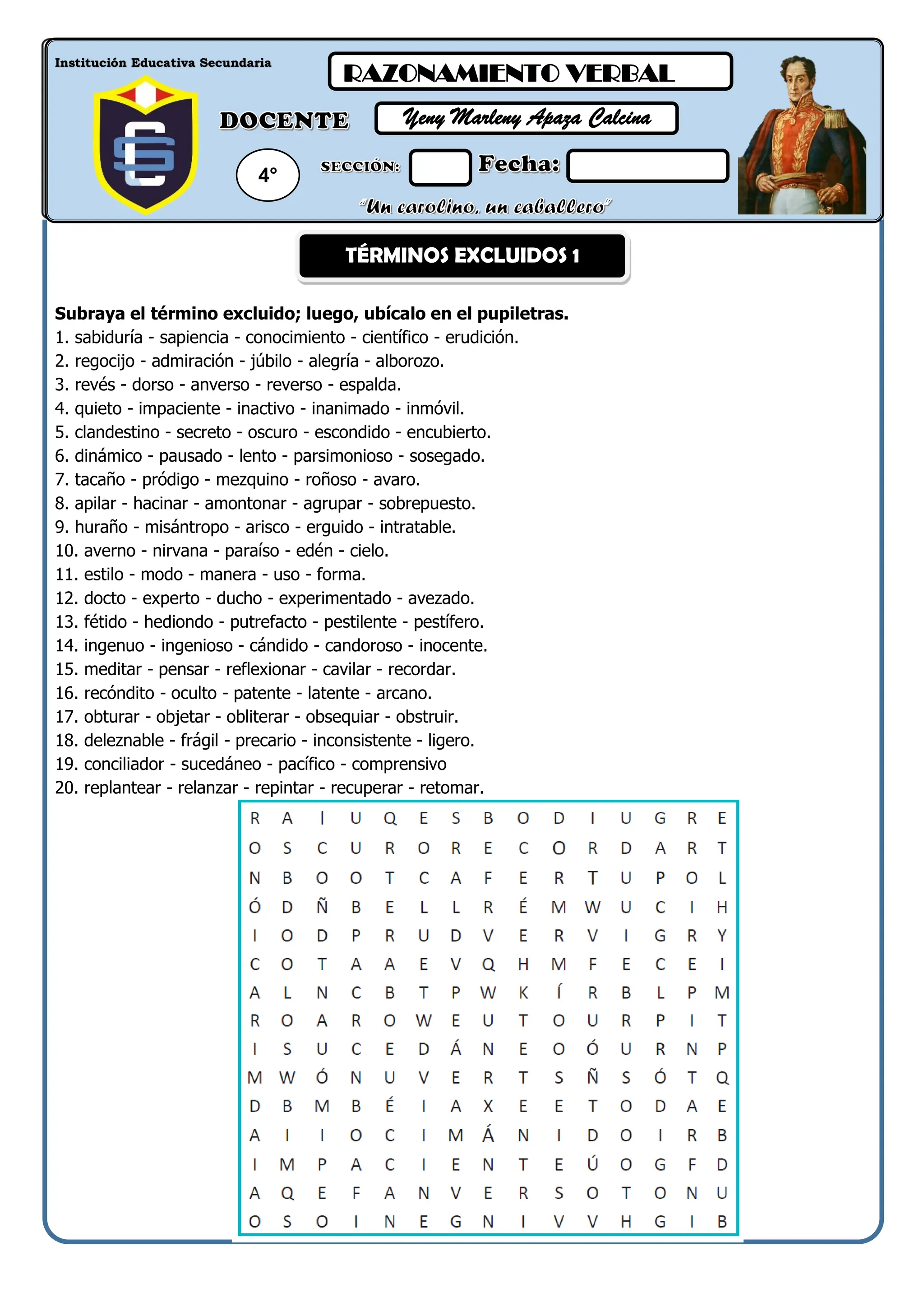 El documento contiene una serie de ejercicios de razonamiento verbal diseñados para reconocer términos excluidos y agrupar palabras según su campo semántico. Se presentan listas de palabras donde se debe identificar la que no se relaciona con las demás, así como actividades para asociar palabras en distintas categorías. Está dirigido a estudiantes de una institución educativa secundaria.