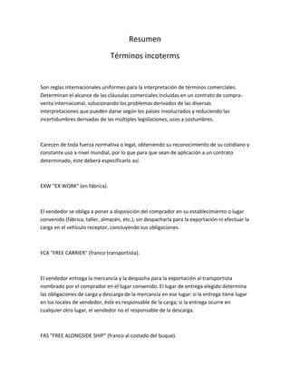 Los términos incoterms son reglas internacionales para la interpretación de cláusulas comerciales en contratos de compraventa internacional. Determinan las obligaciones de cada parte respecto a costos, riesgos y responsabilidades de la entrega de la mercancía. Existen 13 términos incoterms que especifican en qué momento y lugar se transfieren los riesgos entre comprador y vendedor.